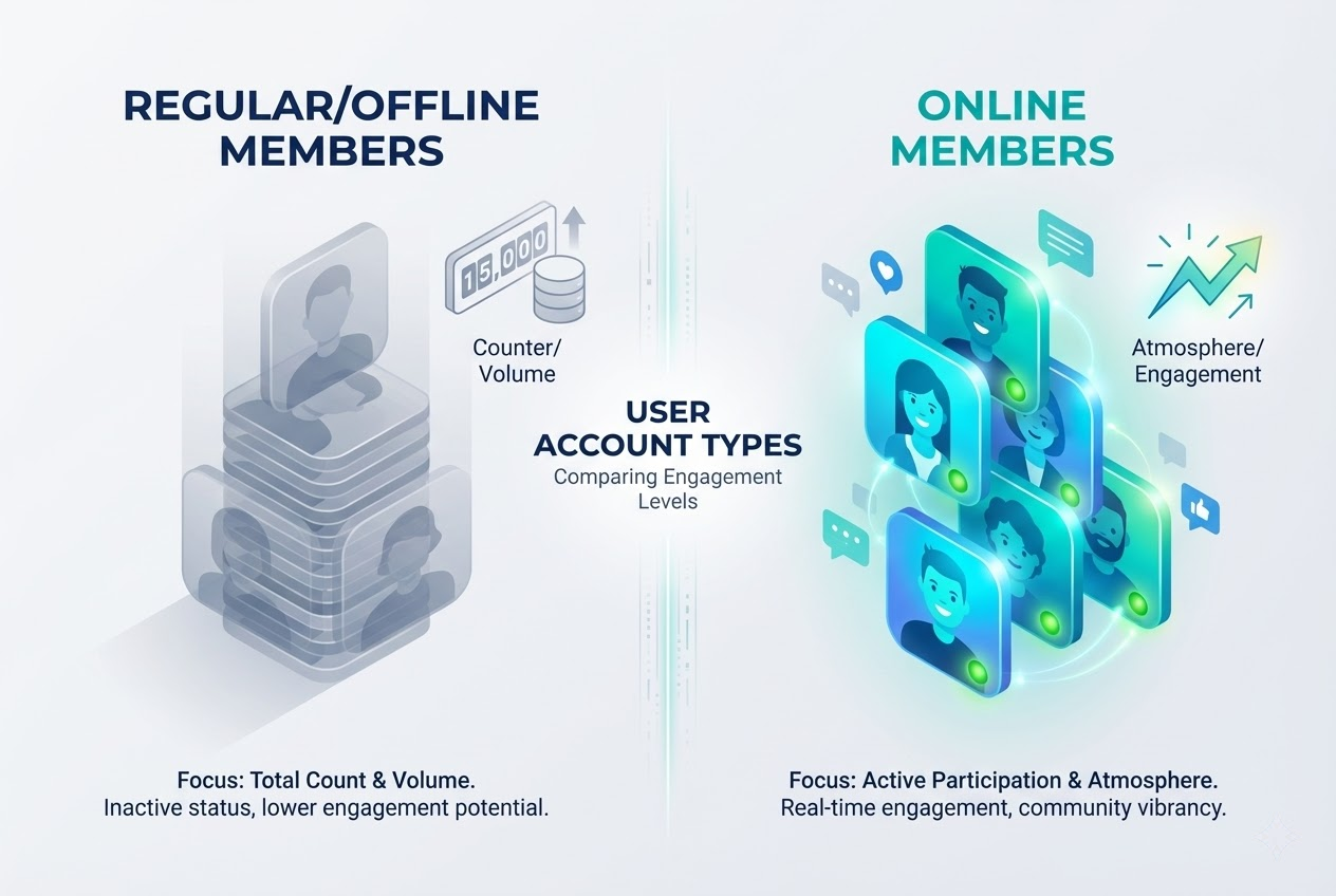 Regular members increase total count. They are usually inactive accounts that appear offline or show "last seen a long time ago." They help a group avoid looking too small, but they do nothing for perceived activity. If the ratio skews too far toward offline accounts, the visible online count collapses even as the member number climbs.